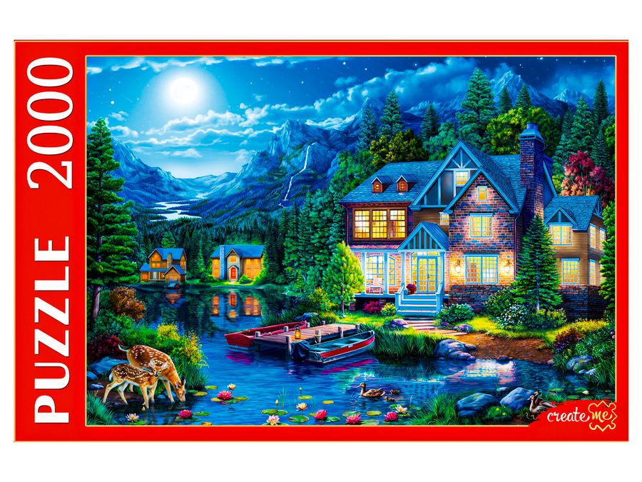 Пазл "Дом у ночного озера" никого не оставит равнодушным! Такой занимательный досуг прекрасно развивает мелкую моторику рук, память и внимание. Изготовлено из картона высокого качества. Количество элементов: 2000 шт. Размер поля: 92х68 см. поле: 680*920 коробка: 355х235х50