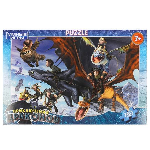 Классические пазлы в коробке «Приключения драконов» ТМ «Умные игры» - отличная развивающая игра для детей: - 260 деталей - размер готовой картинки: 331 х 238 мм - яркие цвета - любимые персонажи - все элементы хорошо и плотно соединяются друг с другом Данный пазл представляет собой игру-головоломку, в которой необходимо в правильной последовательности соединить элементы друг с другом и получить в результате красочную картинку с изображением героев известного мультфильма про драконов. Сборка пазлов - это очень увлекательное занятие, в процессе которого дети учатся искать и совмещать детали разной формы, с каждым разом делая это всё лучше и быстрее. Собирая пазлы ТМ «Умные игры», ребёнок будет развивать: - внимание - память - мышление - моторику - усидчивость Размер упаковки: 285 x 190 x 33 мм. Материал: картон. Рекомендовано детям от 7-ми лет.
