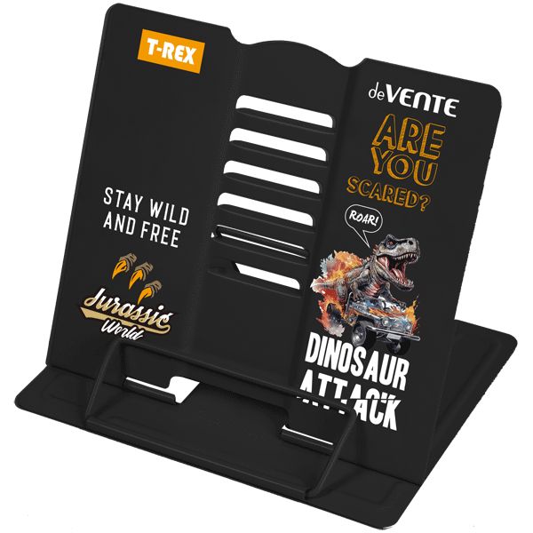 Подставка для учебников и книг "deVENTE. T-Rex" 15,4x15,2 см, металлическая окрашенная, вес 235 г, с противоскользящими ножками, синяя, с полноцветным рисунком, в пластиковом пакете с европодвесом.