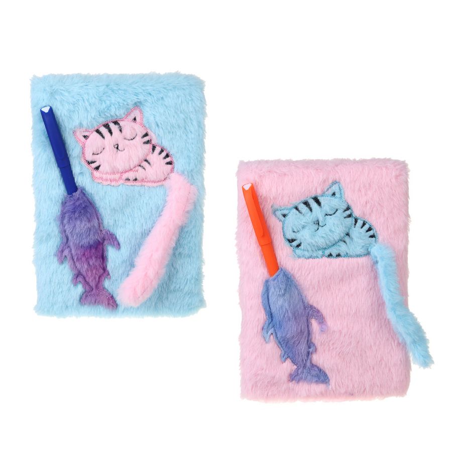 Записная книжка А5, 21,5х14,5см, 80л., иск.мех, аппликация, ручка в кармашке, "Котик с рыбкой", 2цв.