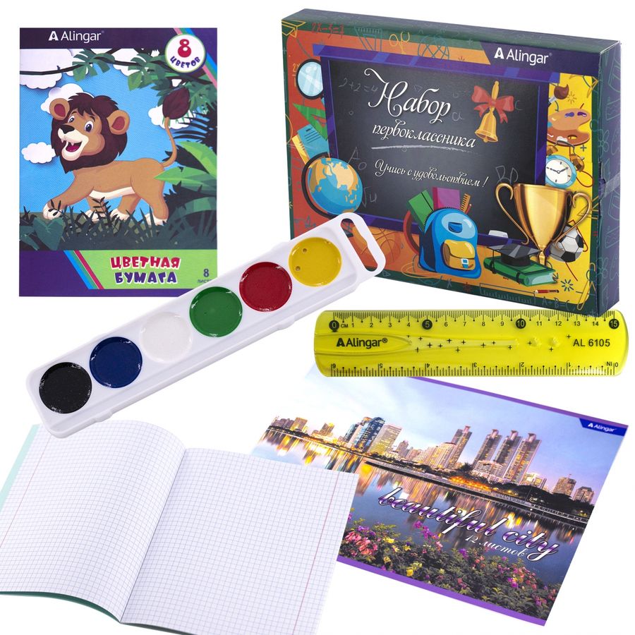 Тетрадь 12 листов, клетка, обложка офсет. бумага – 5 шт. Тетрадь 12 листов, косая, обложка офсет. бумага – 5 шт. Обложка для тетрадей - 10 шт. Бумага цветная А4, 8 листов, 8 цветов, на скрепке - 1 шт. Пластилин 6 цветов, 90 гр., без стека - 1 шт. Карандаши цветные 6 цветов - 1 шт. Клей-карандаш 9 гр. – 1шт. Карандаш чернографитный HB, с ластиком - 1 шт. Ластик синтетический каучук - 1шт. Ручка шариковая синяя, 0,7 мм., пластиковый корпус – 1 шт. Ножницы детские 11 см, пластиковая ручка - 1шт. Линейка 20 см, пластиковая – 1 шт. Фломастеры 6 цветов – 1 шт. Картон цветной А4, 10 листов, 10 цветов – 1шт. Акварель 12 цветов, без кисти - 1 шт. Кисть белка , №2, круглая – 1 шт.