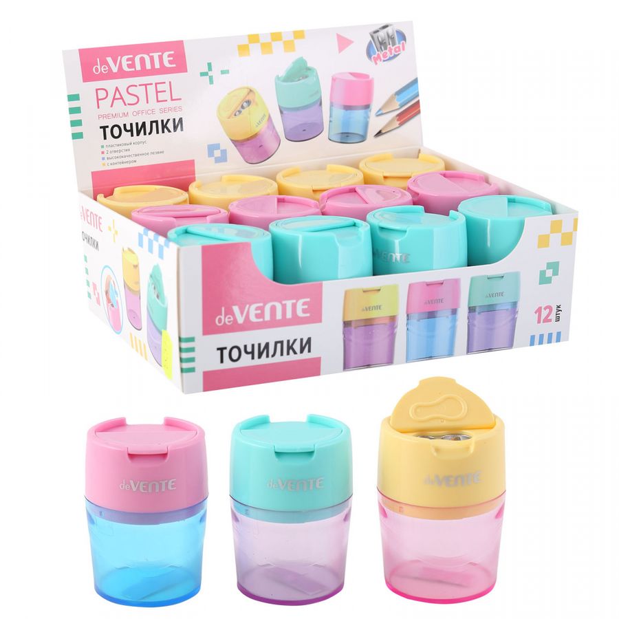 Точилка для карандашей "deVENTE. Pastel" 2 отверстия, пластиковая с контейнером, каждая с индивидуальной маркировкой, ассорти, в картонном дисплее