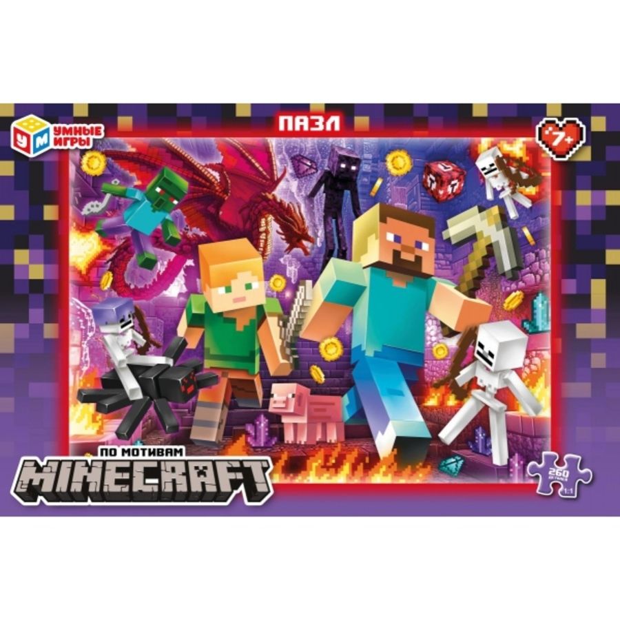 Классические пазлы в коробке «По мотивам Minecraft» ТМ «Умные игры» - отличная развивающая игра для детей: - 260 деталей - размер готовой картинки: 331 х 238 мм - насыщенные цвета - все элементы хорошо и плотно соединяются друг с другом Данный пазл представляет собой игру-головоломку, в которой необходимо в правильной последовательности соединить элементы друг с другом и получить в результате красочную картинку с изображением героев в стиле популярной компьютерной игры. Сборка пазлов - это очень увлекательное занятие, в процессе которого дети учатся искать и совмещать детали разной формы, с каждым разом делая это всё лучше и быстрее. Собирая пазлы ТМ «Умные игры», ребёнок будет развивать: - внимание - память - мышление - моторику - усидчивость Материал: картон. Рекомендовано детям от 7-ми лет.