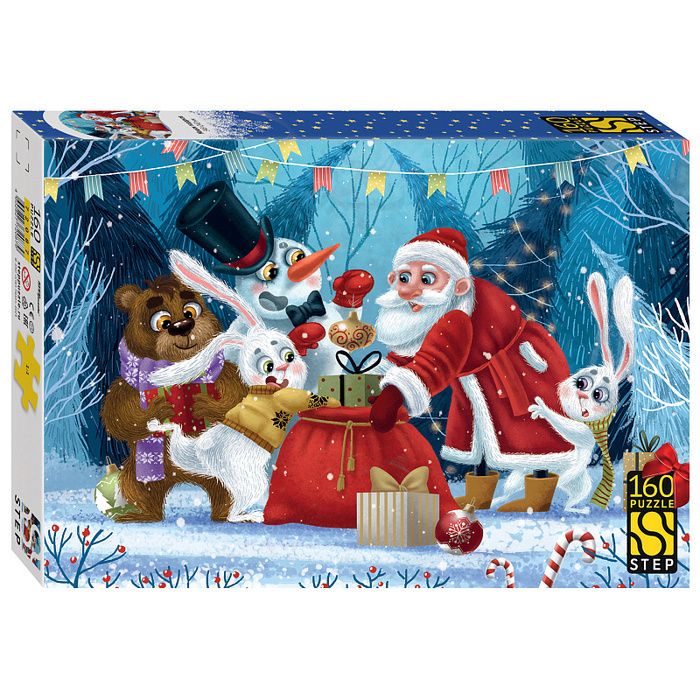 Пазл «Мешок подарков» с ярким изображением новогодней сценки в лесу. Характеристики пазла: -стандартные детали пазла (2×2,3 см); -размер собранного изображения – 24х34,5 см; -материал – картон; -качественное изображение; -экологически чистые, нетоксичные материалы (компания Step Puzzle гарантирует высокое качество пазла и точность подгонки). Для кого? Пазл подходит для детей от 6 лет. Пазлы на зимнюю тематику идеально подходят для совместного семейного досуга.