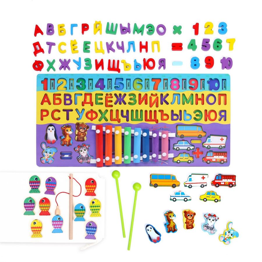 Эта игрушка создана для первых занятий с малышом. Играя с ней, ребёнок познакомится с буквами и цифрами. Магнитная рыбалка поможет потренировать моторику и координацию движений, а металлофон — слуховое восприятие. Как играть Найдите каждой букве и цифре своё место. Когда ребёнок будет складывать деталь в ячейку, проговаривайте её название. Составляйте простые слова и примеры. Разыгрывайте сюжеты с фигурками животных и машинок. Ловите рыбок на магнитную удочку, а затем, так же с помощью удочки, попробуйте поставить из на место. Составляйте наглядные примеры, используя рыбок. Ударяя по определённым пластинам металлофона, попросите ребёнка повторить за вами. С каждым новым разом удлиняйте мелодию на один звук.