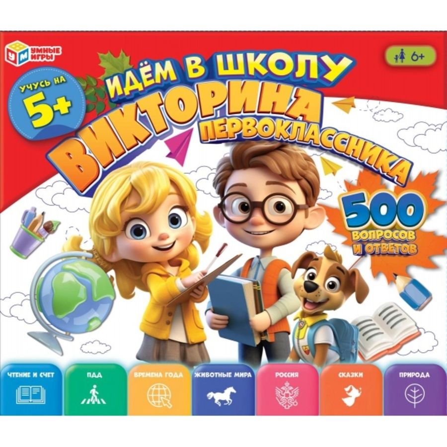 Викторина первоклассника «Идём в школу» ТМ «Умные игры» - интеллектуальная игра для полезного и интересного досуга ребёнка. Особенности: - 500 вопросов - 500 ответов - яркое игровое поле с различными темами: чтение и счёт, ПДД, времена года, животные мира, Россия, сказки, природа - для 2-4 игроков - дополнительный вариант игры «Домашнее задание» Состав игры: - 28 карт «Математика» - 28 карт «ИЗО и музыка» - 28 карт «Физкультура и ОБЖ» - 28 карт «Живой мир» - 28 карт «Русский язык» - 28 карт «Окружающий мир» - 4 фишки - 1 игровой кубик - инструкция 500 вопросов на 6 интересных тем для любознательных первоклассников помогут вспомнить старое и узнать что-то новое и интересное! В ходе игры все участники отвечают на разнообразные вопросы с карточек, относящихся к той или иной теме. Задача игроков - кидать кубик и передвигать свою фишку на выпавшее количество очков. Так определяется тема вопроса, игрок отвечает поочерёдно на все вопросы с карточки, соответствующей выпавшей теме. Если игрок справился со всеми вопросами, он получает 2 жетона, если ответил на два - 1 жетон, только на один - ни одного жетона. Если участник не ответил ни на один вопрос, он пропускает следующий ход. Игра заканчивается, когда все участники приходят на клетку ФИНИШ. Побеждает игрок, которому удалось ответить на большее количество вопросов и заработать наибольшее количество жетонов. Вариант игры «Домашнее задание» В этом варианте ребёнку будет легче усвоить новые знания и подготовиться к школе, если большой объём материала ещё не пройден. Ход игры выглядит следующим образом: участник бросает кубик, ориентируясь на расписание уроков, делает соответствующее количество шагов по дорожке нужного цвета; ведущий берёт карточку, предлагает участнику дать ответ. Если ребёнок знает ответы, то он просто получает то же количество жетонов, что и в первом варианте игры, ход переходит к следующему игроку. Если ребёнок не знает ответов на вопросы, то ведущий называет правильный ответ, объясняет материал, если требуется. Карточка остаётся у участника. Ход переходит к следующему игроку. В следующий ход участник отдаёт карточку, лежащую перед ним, ведущему и старается снова ответить на вопросы, а также, при необходимости, на уточняющие вопросы ведущего. Викторина ТМ «Умные игры» развивает: - кругозор - внимание - усидчивость - память Размер: 320 x 265 x 50 мм. Материал: картон + пластмасса. Рекомендовано детям от 6-ти лет.