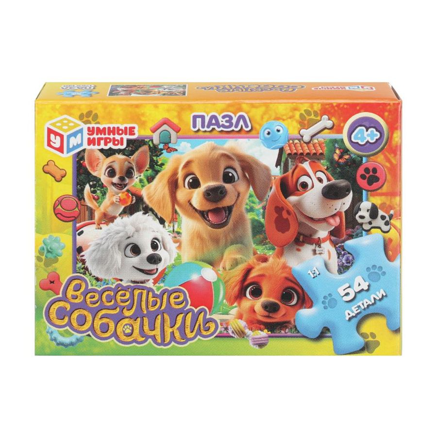Классические пазлы в коробке «Весёлые собачки» ТМ «Умные игры» непременно понравятся маленьким любознайкам: - 54 детали - размер готовой картинки: 175 х 130 мм - яркие цвета - милые персонажи - все элементы хорошо и плотно соединяются друг с другом Данный пазл представляет собой игру-головоломку, в которой необходимо в правильной последовательности соединить элементы друг с другом и получить в результате красочную картинку с забавными щенками. Сборка пазлов – это очень увлекательное занятие, в процессе которого дети учатся искать и совмещать детали разной формы, с каждым разом делая это всё лучше и быстрее. Собирая пазлы ТМ «Умные игры», ребёнок будет развивать: - внимание - цветовое восприятие - логическое мышление - мелкую моторику - усидчивость Размер: 90 х 65 х 25 мм. Материал: картон. Рекомендовано детям от 4-х лет.