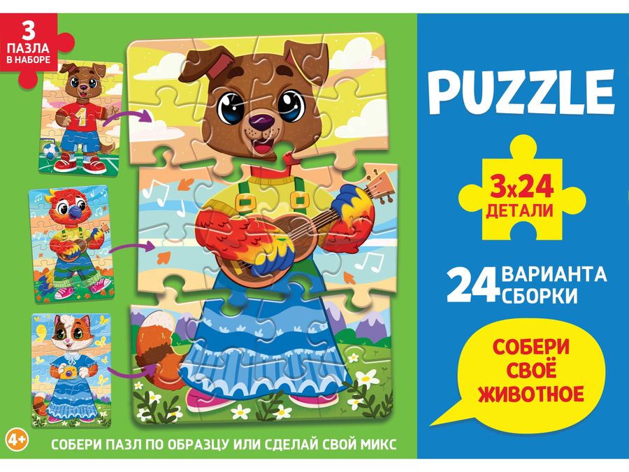 Представляем пазл 3в1 "Животные". Это увлекательная игра для детей и взрослых, которая поможет развить логическое мышление и мелкую моторику. Пазл выполнен из качественных материалов, что обеспечивает его долговечность и безопасность для детей.