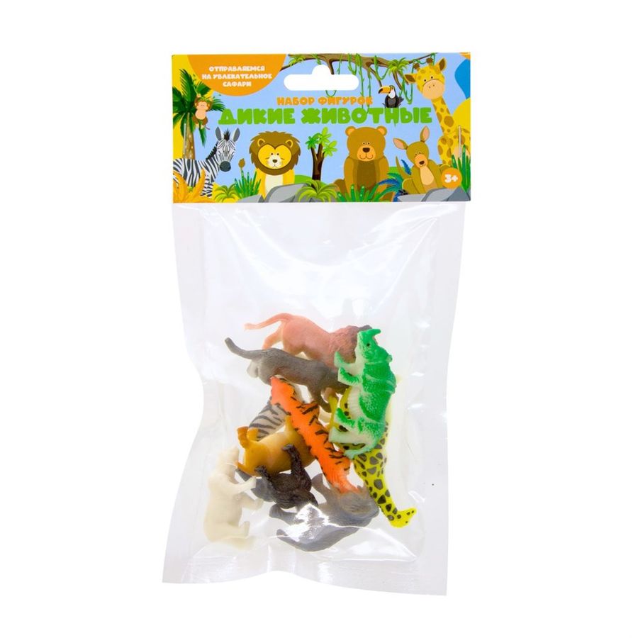 Отправляемся на сафари! В наборе «Дикие животные» вы найдёте фигурки диких животных. Такой набор поможет придумать множество интересных историй и разнообразить игру ребёнка. Игрушки изготовлены из прочного пластика и упакованы в пакет с красочным хедером и европодвесом. Играя с такими фигурками и придумывая диалоги, ребёнок развивает фантазию и учится коммуникации. Благодаря небольшому размеру фигурки помещаются в детскую ладошку и хорошо стоят на столе. Они помогут быстро запомнить названия животных, поэтому их смело можно использовать в качестве обучающего материала. В наборе: фигурки животных 10 шт. Упаковка: пластиковый пакет с хедером 21 х 12 см Возраст: 3+