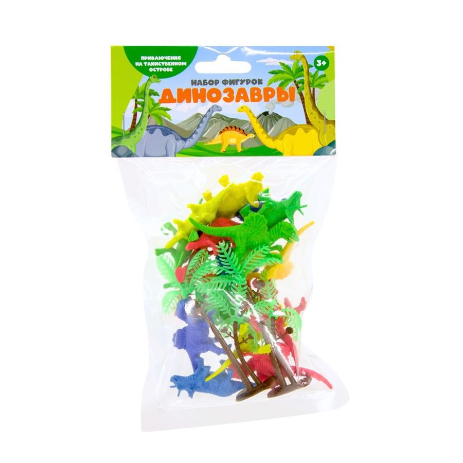 Создайте свой таинственный остров вместе с набором фигурок «Динозавры»! В упаковке вы найдете восемнадцать фигурок, среди них – две пальмы. Пусть ребёнок сочинит историю с разноцветными динозаврами, всё необходимое есть в этом наборе. Игра с такими фигурками отлично развивает фантазию, ребёнок учится придумывать сценки и диалоги. Устойчивые фигурки изготовлены из твёрдого пластика и упакованы в пакет с красочным хедером и европодвесом. Такие фигурки можно использовать для игры, а также в качестве обучающего материала для изучения счёта и цветов. Узнавать новое намного интереснее вместе с любимыми персонажами – динозавриками! В наборе: фигурки динозавров 18 шт. Упаковка: пластиковый пакет с хедером 21 х 12 см Возраст: 3+