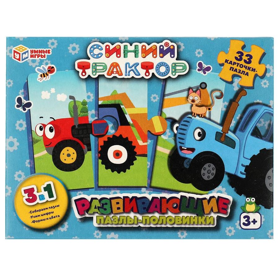 Пазлы-половинки «Синий Трактор» ТМ «Умные игры» - отличная развивающая игра для самых маленьких: - 33 карточки-пазла - 3 в 1: собираем пазлы, учим цифры, знакомимся с формами и цветами - крупные детали - любимые герои - красочный дизайн - плотный картон В наборе 11 картинок, каждая из которых разделена на 3 части. Задача ребёнка – подобрать части пазлов так, чтобы собралось изображение того или иного персонажа популярного детского мультсериала. Благодаря небольшому количеству деталей, малыш без труда сможет выполнить задание, с каждым разом делая это всё лучше и быстрее. Кроме того, на оборотной стороне пазлов содержится информация о цифрах, цветах и формах, поэтому помимо игры в пазлы малыш будет получать полезные знания и знакомиться с окружающим миром. Собирая пазлы ТМ «Умные игры», ребёнок будет развивать: - внимание - память - мышление - моторику - усидчивость Размер упаковки: 155 x 115 x 30 мм. Материал: картон. Рекомендовано детям от 3-х лет.