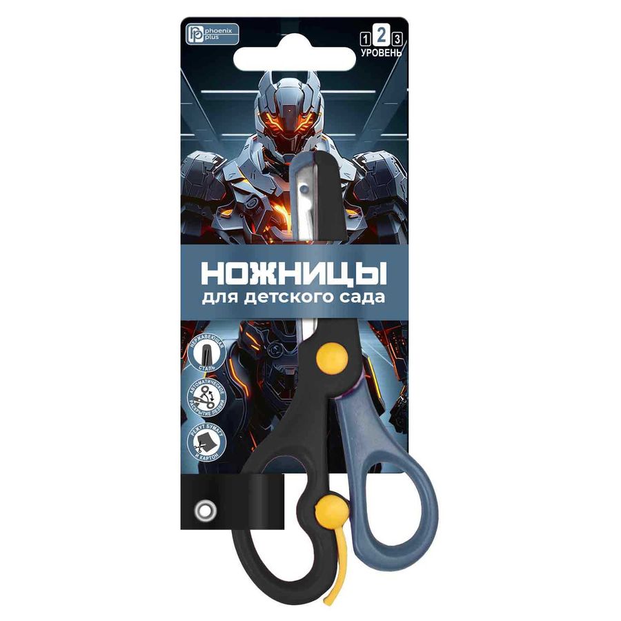 Ножницы для детей Феникс+, арт.68489/ 24 ОГНЕННЫЙ РОБОТ (серый, чёрный, 13,5х6,2 см, длина лезвия: 4,8 см, нержавеющая сталь, асимметричные, для бумаги, картона, лезвия в пластиковом корпусе, с возвратным механизмом, картонная подложка с европодвесом)