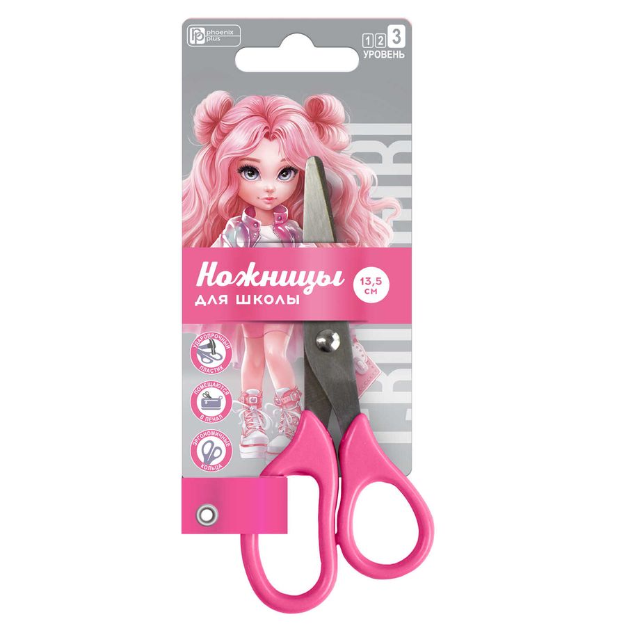 Ножницы для детей Феникс+, арт.69126/ 24 КРАСОТКА (серый, розовый, 13,5х5,6 см, длина лезвия: 5 см, нержавеющая сталь, асимметричные, универсальные, картонная подложка с европодвесом)