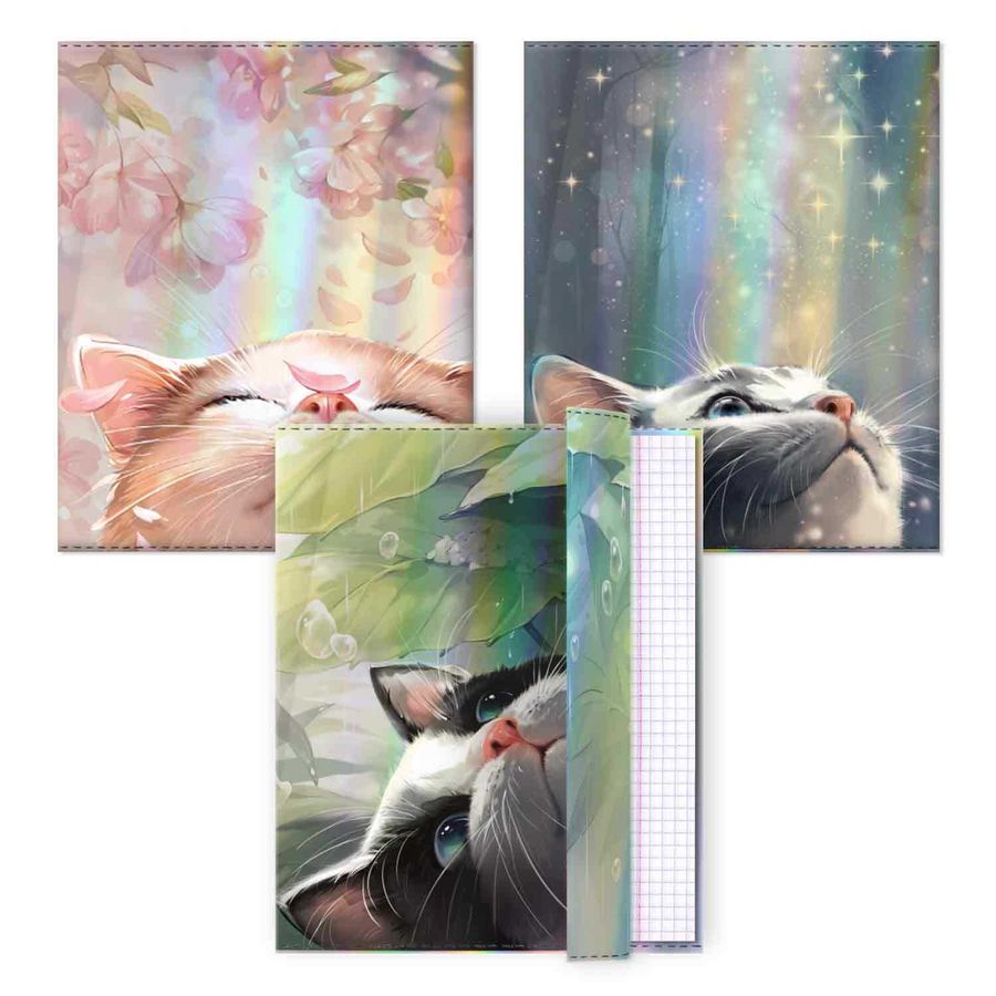 Обложки для тетрадей с голографическим рисунком. ЛУЧЕЗАРНЫЙ КОТ. Комплектность: 3 шт. в наборе. Размер: 346х215 мм. Материал: ПВХ. Плотность: 70 мкм. Особенности: вкладыш с тремя наклейками для персонализации. Цвет - зелёный, розовый, сиреневый.