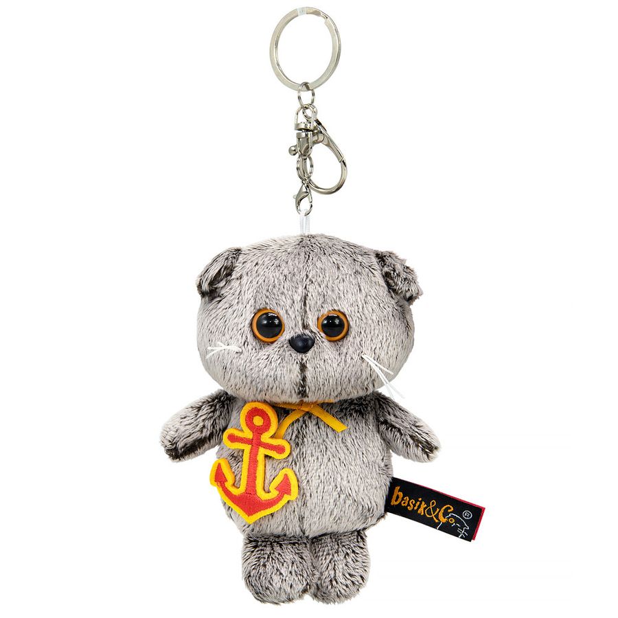 Малыш Басик с якорем и с жёлтым атласным бантиком. Якорь выполнен из фетра красного цвета с вышивкой. У брелка удобный составной карабин с кольцом и застежками.