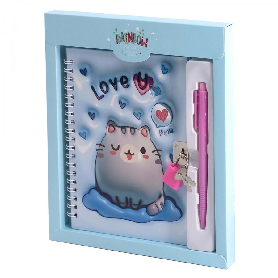 Набор Блокнот с замком 130х180мм 46л клетка тв.обл. + Ручка Кот-пухляш голубой ALINGAR AL12357