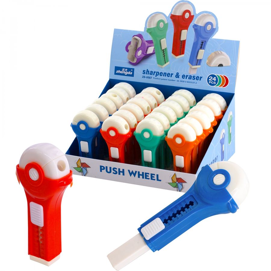 Точилка 1отв. пластик контейнер + ластик Колесо ассорти ALINGAR AL11109