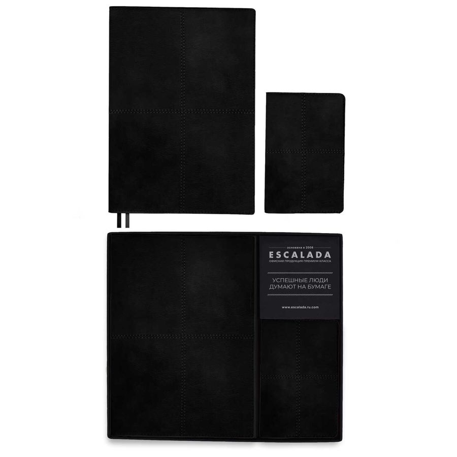 Ежедневник недатированный + обложка для паспорта (набор подарочный) ESCALADA, А5+, 120 л., арт. 70557/ 10 ШЕВРЕТ ЧЁРНЫЙ (кожзам: ежедневника: 175x245 мм, обложки для паспорта: 95х145 мм, мягкий переплёт, запаянный край, материал обложки: искусственная кожа "Шеврет"; способ крепления блока: ниткошвейный; декор: блинтовое тиснение, отделочная строчка; вн. блок: 120 л., кремовый офсет 70 г/м², печать в одну краску (клетка), справочный материал: есть; перфорация углов блока: нет; отделка среза: окрашивание пантоном; закладка/-и: два ляссе, каптал: есть; форзац: печать пантоном, персонализация возможна: да; индивидуальная упаковка: подарочная картонная коробка с ПВХ-крышкой + ПЭТ-пакет)