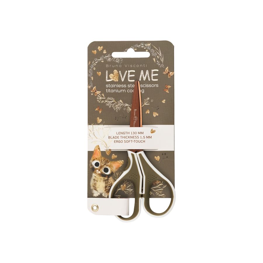 Ножницы из нержавеющей стали с титановым покрытием «Love me.Милый котик» ТМ Bruno Visconti — это сочетание стильного дизайна, отменного качества и высокой функциональности. Их продуманная конструкция и эргономичные прорезиненные ручки гарантируют плавный ход лезвий и удобство использования. Остро заточенные стальные лезвия толщиной 1,5 мм легко справятся с плотной бумагой и картоном. Безопасные закругленные кончики и специальное тефлоновое покрытие, предотвращающее прилипание скотча и клея, делают эти ножницы идеальным выбором.