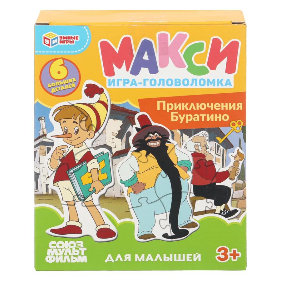 Макси-пазлы «Союзмультфильм. Приключения Буратино» ТМ «Умные игры» — интересная развивающая игра для самых маленьких: - 6 больших пазлов - крупные элементы - удобно для детских пальчиков - любимые персонажи - красочный дизайн - плотный картон Задача ребёнка – подобрать детали из набора так, чтобы собрать картинки с изображением героев известного мультфильма студии «Союзмультфильм» – всего 6 вариантов. Благодаря небольшому количеству деталей, малыш без труда сможет выполнить задание, с каждым разом делая это всё лучше и быстрее. Собирая пазлы ТМ «Умные игры», ребёнок будет развивать: - внимание - память - мышление - моторику - усидчивость Размер упаковки: 150 x 180 x 40 мм. Материал: картон. Рекомендовано детям от 3-х лет.