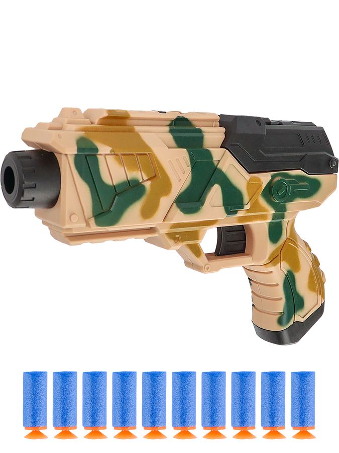 Пистолет. Размер пистолета: 20х1х14 см. Размер коробки 20,5*5*15 см.10 софт-патронов. Для перезарядки пистолета необходимо передернуть затвор.