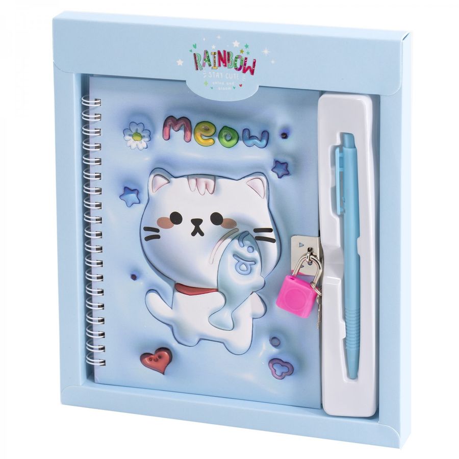Подарочный блокнот в футляре, 19 см * 12,5 см, гребень, Alingar, ламин, конгрев, эффект 3D, ручка, замочек, клетка, 45 л., "Котик", голубой AL12319