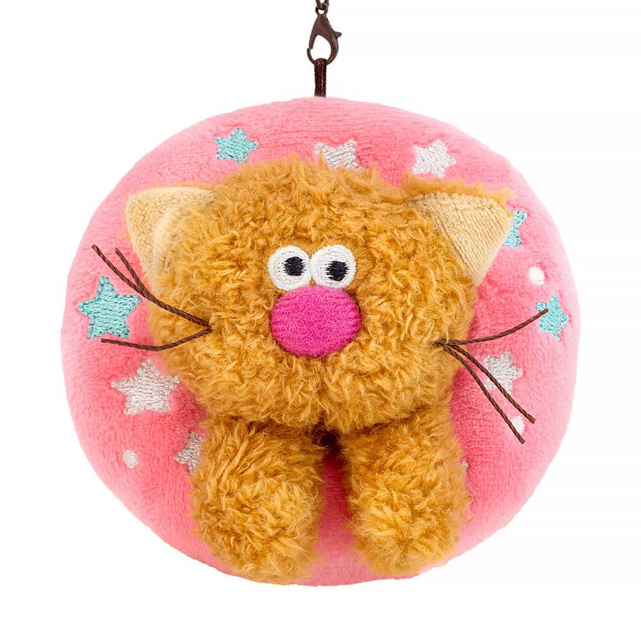 Забавный брелок в виде милого котёнка Кортадо из тактильно приятного эко меха в двух оттенках: шоколадного цвета и цвета песочного печенья. Котёнок расположился в пышном пончике, сшитом из нежного софта. Сам пончик цвета выпечки, а сверху крем цвета розовой помадки с вышитыми карамельными звёздочками. У брелока удобный карабин шоколадного цвета с застежками, который можно отстегнуть. У кофейного котика и десерта есть петелька, каждого можно использовать по отдельности как брелок.