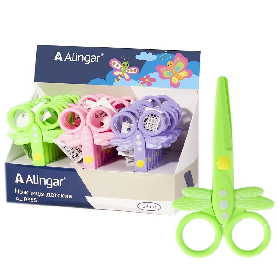 Ножницы детские, Alingar, 12 см, пластиковые ручки, безопасные лезвия, закругленные концы, "Стрекоза", три цвета, картонный стенд