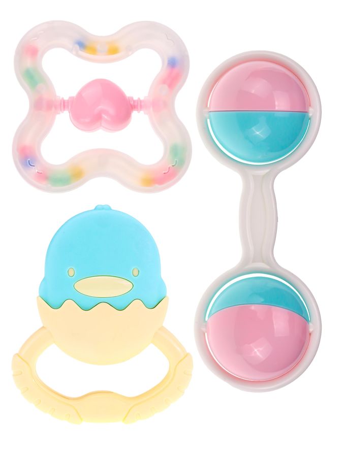 Что может быть проще погремушки? Ничего! Пожалуй именно этим и объясняется популярность подобной забавы для грудных детей. Но полагать, будто погремушки помогает только отвлекать и веселить малыша, ошибочно. Ведь они приносят еще и огромную пользу для развития маленького человека: он учится фокусировать взгляд на погремушке, развивает свой слуховой аппарат и тактильные ощущения, улучшает мелкую моторику, познает пространство и свойства предметов, в определенный период жизни еще и успокаивает с помощью такой игрушки прорезывателя начинающие резаться первые зубки.Нельзя кипятить и стерилизовать в стерилизаторе. Погремушки можно помыть в теплой воде или протереть влажной салфеткой. В пакете 3 шт.