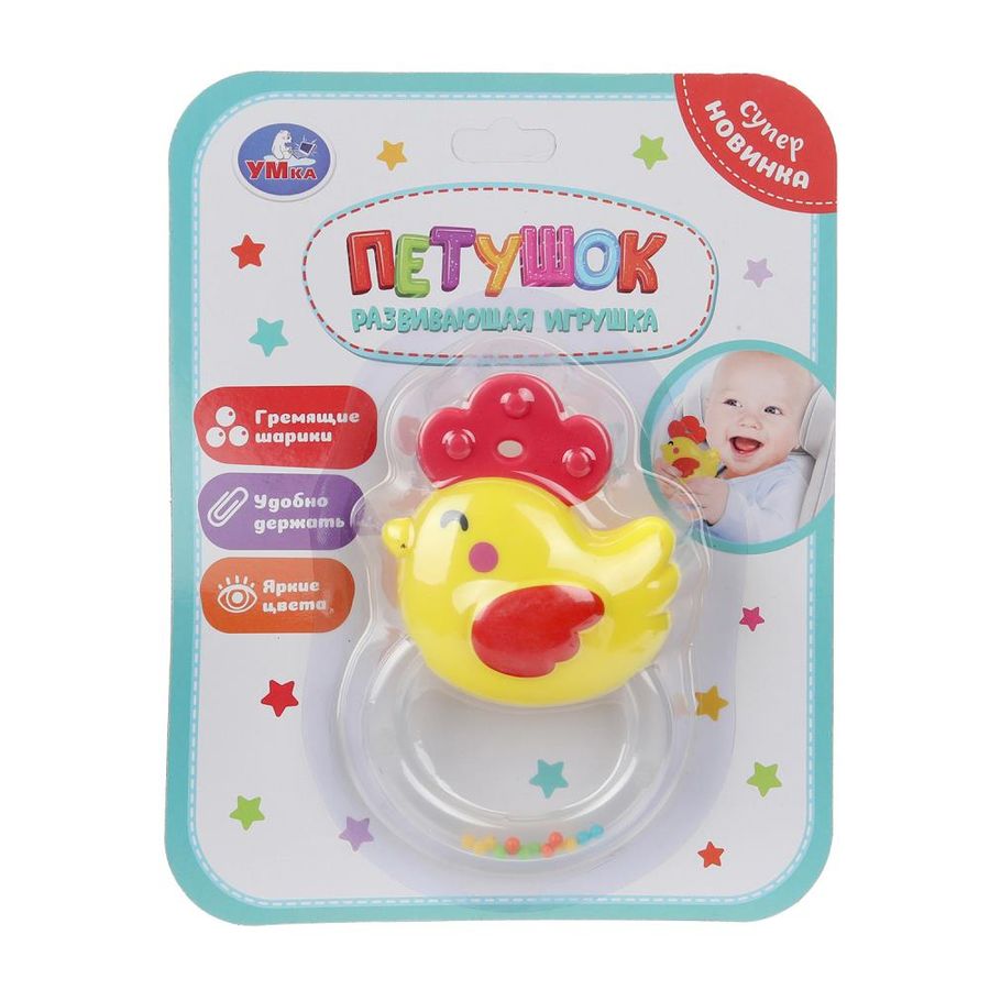 Погремушка на кольце «Петушок» ТМ «УМка» разработана специально для малышей: - звуковые эффекты - гремящие шарики - яркие цвета - интересная форма - удобно держать Этот очаровательный персонаж станет новой, любимой игрушкой вашего ребёнка. Она выполнена из прочного, гипоаллергенного материала яркой расцветки. У погремушки есть прозрачная ручка из пластмассы, внутри которой находятся маленькие разноцветные шарики. Во время игры с погремушкой звуки гремящих шариков привлекают внимание малыша и успокаивают его. Игра с погремушкой ТМ «УМка» развивает: - слуховое восприятие - тактильные навыки - моторику - внимание - визуальное восприятие - цветовосприятие Размер: 13,5 см. Материал: пластмасса + текстиль. Рекомендовано детям раннего ясельного возраста.