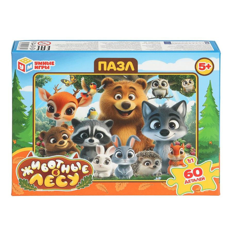 Классические пазлы в коробке «Животные в лесу» ТМ «Умные игры» непременно понравятся маленьким любознайкам: - 60 деталей - размер готовой картинки: 330 х 237 мм - насыщенные цвета - все элементы хорошо и плотно соединяются друг с другом Данный пазл представляет собой игру-головоломку, в которой необходимо в правильной последовательности соединить элементы друг с другом и получить в результате красочную картинку с изображением милых лесных обитателей. Сборка пазлов – это очень увлекательное занятие, в процессе которого дети учатся искать и совмещать детали разной формы, с каждым разом делая это всё лучше и быстрее. Собирая пазлы ТМ «Умные игры», ребёнок будет развивать: - внимание - цветовое восприятие - логическое мышление - мелкую моторику - усидчивость Размер упаковки: 190 x 141 x 35 мм. Материал: картон. Рекомендовано детям от 5-ти лет.