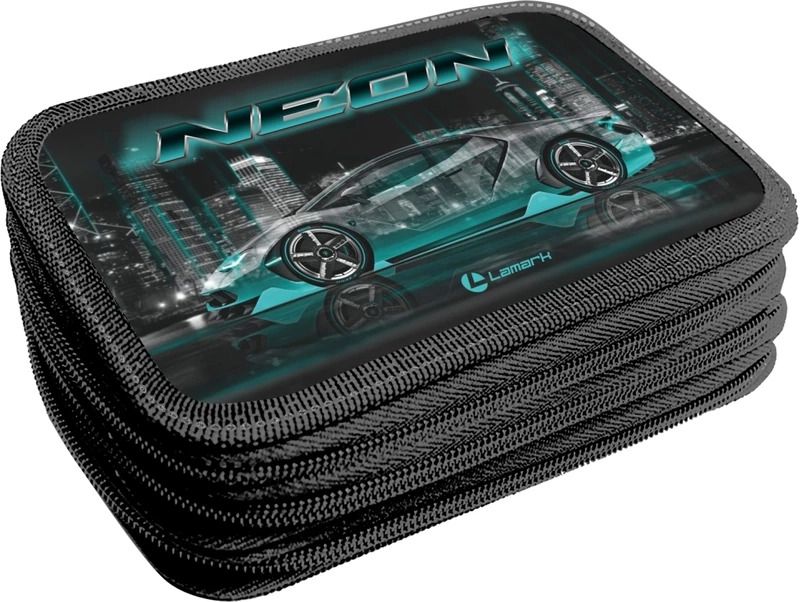 Пенал Lamark "Neon Car" на 3 отделения, на 53 предмета. Размер 125х205х55 мм. Ламинированный картон полноцветная печать, три молнии. Для канцелярских принадлежностей.