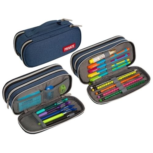 Пенал "deVENTE. Private" 22x9x8 см, овальный для 100 предметов, 3 отделения на молнии, 2 отделения с внутренним органайзером, текстильный, с ручкой, с каучуковой аппликацией, темно-синий