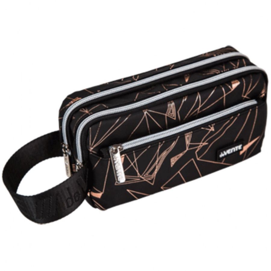 Пенал "deVENTE. Zig" 20,5x9,5x7 см, прямоугольный для 100 предметов, фактурный антивандальный нейлон с рисунком металлик, 2 отделения на молнии, наружный карман на молнии, ручка-жаккардовая репсовая лента, черный и розовое золото