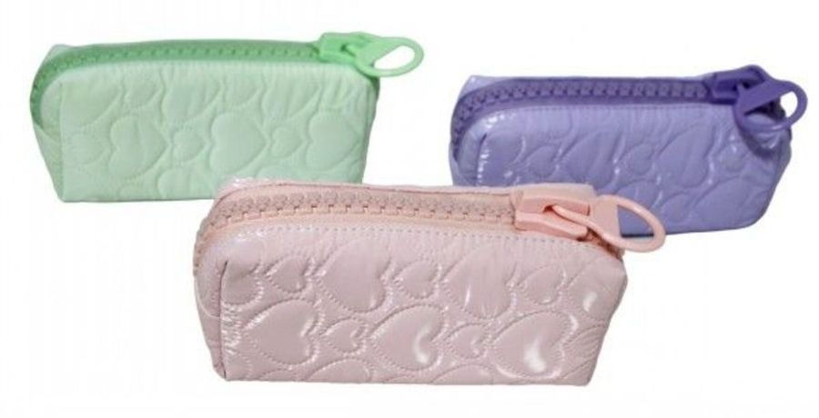 Пенал 20x9x6,5 см, выполнен из высококлассного тактильного материала - мягкой, стёганой плащёвки; узор в виде сердец по всему периметру, тракторная молния в цвет самого изделия, формообразующий материал внутри, индивидуальная упаковка из жесткого пластика, ассорти 3 дизайна