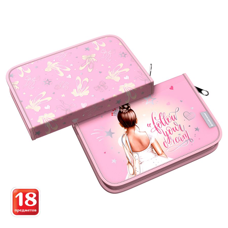 Эта модель (13,5x20,5x3 см) представляет собой классический жестко-каркасный пенал-книжку с удобной системой фиксации школьных принадлежностей. Материал пенала – износостойкий и прочный 100% полиэстер 600D. У модели имеется надёжная расширенная молния с мягким ходом, что облегчает частое закрытие и открывание. Наполнение (18 предметов): ручка шариковая, синие чернила: 2 шт., чернографитный карандаш HB: 1 шт., фломастеры: 6 цветов, цветные карандаши: 6 цветов, ластик: 1 шт., точилка: 1 шт., линейка пластиковая 15 см: 1 шт. Пенал-книжка удобен для школы, а его дизайн делает его весьма модным аксессуаром.