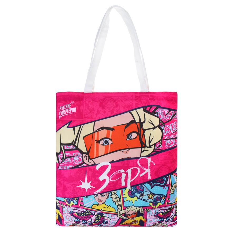 Сумка-шоппер 38х42 см BY Русские Супергерои "Заря фэшн" из полиэстера под ткань – это удобный аксессуар для покупок, который заменит одноразовые пакеты, а также может использоваться в качестве легкой сумки для прогулок. Имеет выразительный стильный дизайн с изображением персонажа проекта Русские Супергерои. Предусмотрен внутренний карман для ценных вещей или мелочей. Удлиненные ручки 58 см позволят носить аксессуар на плече. Материал не рвется, устойчив к износу и проколам, поэтому изделие прослужит долго.