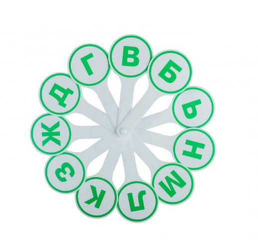 Веер буквы (согласные), изготовлен из качественного пластика. Веер познакомит ребенка с согласными буквами. Состоит из 11 двусторонних карточек, скрепленных между собой. Цвет зеленый. Диаметр — 70 мм, толщина — 12 мм.