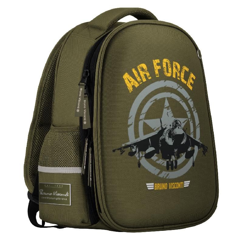 РЮКЗАК-КАПСУЛА ТЕМНО-ЗЕЛЕНЫЙ С ЭРГОНОМИЧНОЙ СПИНКОЙ "МИЛИТАРИ AIR FORCE" Арт. 12-009-036/11 Рюкзак школьный «МИЛИТАРИ AIR FORCE» ТМ Bruno Visconti имеет жесткий корпус: передняя и боковые стенки выполнены из усиленного материала, что обеспечивает эффект «капсулы». Для его производства использовалась ткань premium качества: водонепроницаемая, морозостойкая, с повышенной износостойкостью, грязеотталкивающая плотностью 900 DEN. Благодаря сложнейшим современным технологиям нанесения на ткань рюкзак украшает авторский дизайн, соответствующий последним трендам. Плотная фирменная подкладка BRUNO VISCONTI идеально сочетается с дизайном и цветом самого рюкзака. Двунаправленные реверсивные надежные 8-мм молнии с 5-см пуллером на замках позволяют легко открывать и закрывать рюкзак. Комфорт и функциональность обеспечивают: эргономичная, вентилируемая, с анатомическими подушечками спинка; регулируемые лямки анатомической формы с застежкой на клипсе, дополнительно участвующие в правильном распределении веса рюкзака; ручка-подвес из надежного материала, устойчивого к истиранию с усиленным креплением, выдерживающая большие нагрузки; мягкая эргономичная ручка; четыре светоотражающих элемента; кольцо для брелока; усиленное дно, оснащенное резиновыми ножками и защищающее от загрязнения дно рюкзака; отделение с органайзером на молнии и карманом-сеточкой; два боковых кармана для термоса или бутылки с водой; отделение, состоящее из трех частей с двумя разделителями, фиксирующим ремнем и дополненное карманом на молнии для карточки. Размеры: 30х38х20 см, вес - 1100 г, объём - 22,8 л. Рюкзак определенно понравится как маленьким владельцам, так и их родителям.