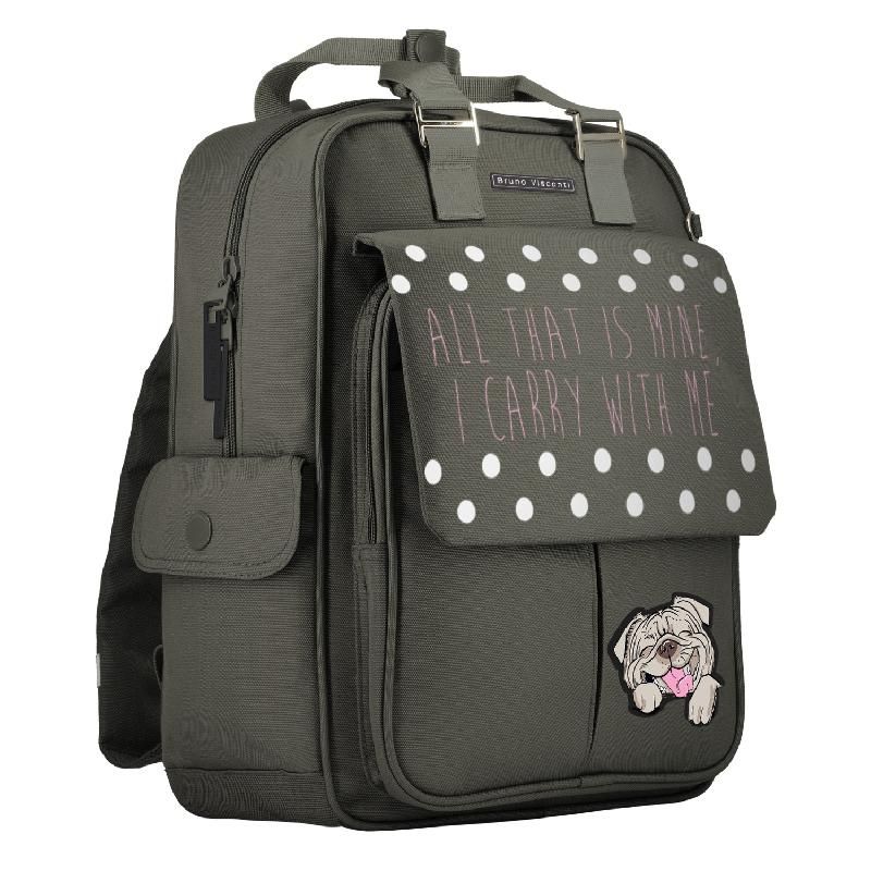 Сумка-рюкзак BrunoVisconti® темно-серый «КАРМАННЫЕ ЖИВОТНЫЕ.СОБАЧКА» Арт. 12-010-020/06 Сумка-рюкзак «КАРМАННЫЕ ЖИВОТНЫЕ.СОБАЧКА» с авторским дизайном и использованием сложнейших современных технологий нанесения на ткань от Bruno Visconti – удобный, практичный и красивый аксессуар, который будет полезен как в период учебных занятий, так и в повседневной жизни. Комфорт, надежность и функциональность рюкзаку обеспечивают: ткань плотностью 900 D - водонепроницаемая, морозостойкая, с повышенной износостойкостью, грязеотталкивающая; двунаправленные реверсивные 8-мм молнии с 5-см пуллером на замках, позволяющие легко открывать и закрывать сумку-рюкзак; мягкая, комфортная спинка; две ручки, объединенные хлястиком на кнопке; широкие регулируемые лямки с усиленным креплением; светоотражающие элементы на лямках; ручка-петля; два боковых кармана с клапанами; передний карман с клапаном на молнии и с двумя отделениями: на липучке и на молнии; вместительное основное отделение с дополнительным отделением для ноутбука из ударокомпенсирущего материала с застежкой на липучке; карабин для ключей на тесьме в основном отделении. Размеры: 29 х 38 х 14 см, вес - 820 г, объём - 15,4 л.