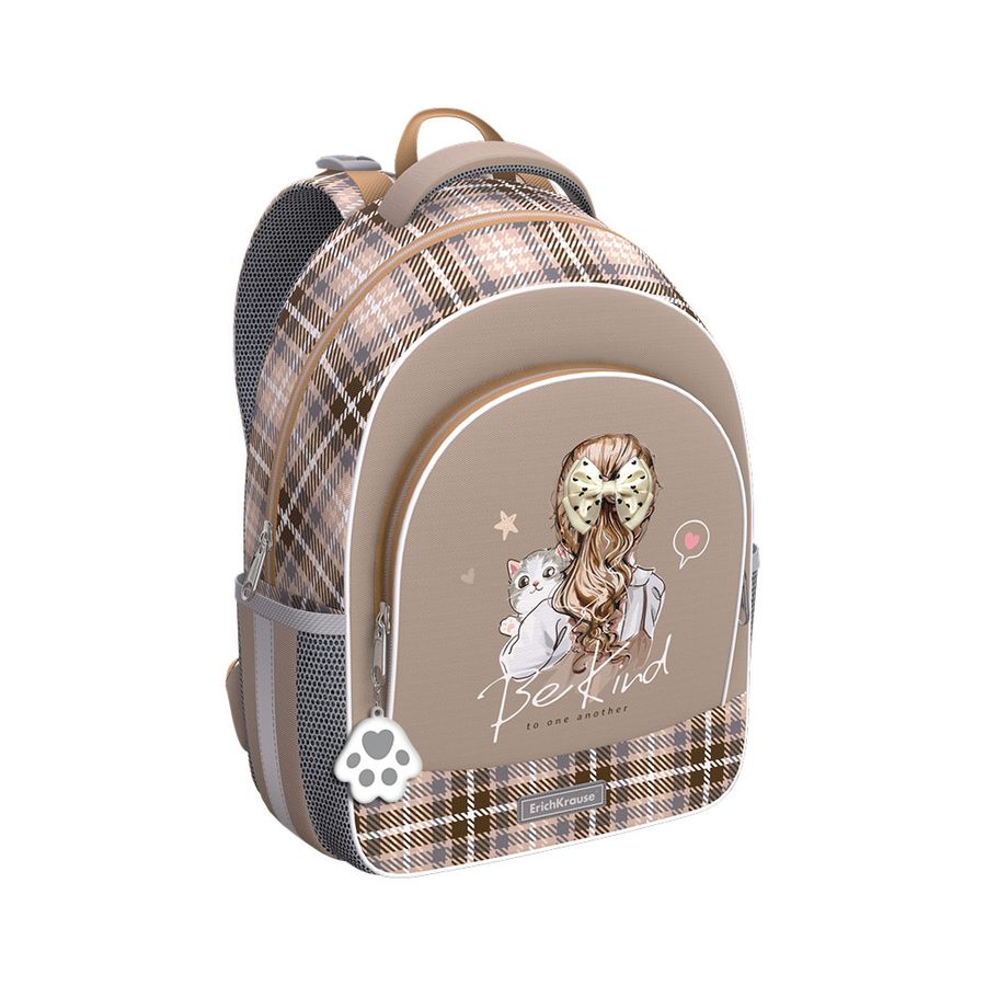 Этот рюкзак размера 39х28х14 см объёмом 15 л изготовлен из полиэстера 600D с полиуретановой пропиткой, что делает его устойчивым к износу и морозу. Внутри вместительное отделение с эластичным фиксатором для тетрадей и учебников формата А4+. Также есть мини-органайзер для мелкой канцелярии и карман на молнии. На дне – жёсткая откидная вставка. Снаружи фронтальный карман на молнии с плавным ходом, а также два боковых на резинке, куда можно положить бутылку с водой или зонтик. Рюкзак весит всего 520 г, что делает его одним из самых лёгких в своей категории. У модели эргономичная спинка ErgoLine® System с грудной перемычкой. Такая конструкция из мягких подушечек равномерно распределяет вес рюкзака и снижает нагрузку на позвоночник. Ткань спинки AirMesh “дышит”, а воздушные каналы между ее подушечками препятствуют образованию влаги. Мягкие S-образные лямки не давят на плечи ребёнка, а грудная перемычка фиксирует положение рюкзака на теле. Светоотражающие элементы по всему периметру повышают безопасность в темноте. Модель также оснащена объёмной и удобной ручкой для переноски в руке. Крепления ручки и лямок усилены дополнительными швами из лавсановых нитей. Пластиковые ножки защищают от загрязнений и влаги. Рюкзак ErichKrause ErgoLine® – оптимальный выбор для занятий в школе.