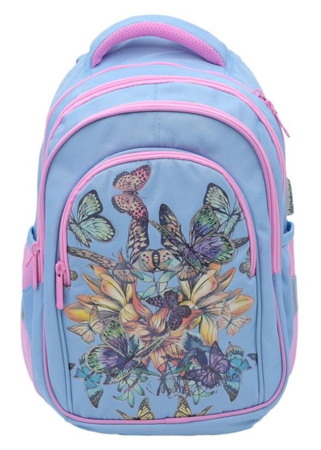 Ранец школьный ПандаРог Бабочки предназначен для детей младшего школьного возраста. Выполнен из вентилируемого полиэстера. Анатомическая ЭВА-каркасная спинка снимает напряжение, позволяет правильно держать осанку, создает необходимый баланс тяжести. Имеет мягкие боковины и переднюю часть. Мягкие широкие лямки не давят на плечи, обеспечивают комфор при использовании, регулируются по длине. Крепкая ручка из ткани, смягченная поролоном и тройной сеткой, не врезается в ладонь ребенка. Устойчивое донышко снабжено ножками для защиты ранца от загряжнения, продлевает срок службы. Застежка-молния позволит комфортно и оперативно наполнять ранец и извлекать его содержимое. Оснащен защитными светоотражающими элементами для обеспечения безопасности ребенка на дороге в темное время. Четыре отделения, разделитель для тетрадей и внутренние карманы позволят разместить и систематизировать школьные принадлежности и необходимые канцелярские товары, способствуют поддержанию порядка. Два боковых кармана можно использовать для хранения необходимых мелочей: ключей, бумажных платков, пластиковой карты, бутылки воды и т.п. Размер ранца 31х20х37 см. Объем 22,5 литров. Вес 0,6 кг. Красочный дизайн ранца ПандаРог Бабочки поднимает настроение ребенка и позволит реализовать свой внутренний потенциал. Поставляется с вложенной воздушной подушкой, упакован в фирменные пакет и картонный короб. В комплект к ранцу вы можете приобрести формованные пенал и мешок для сменной обуви в аналогичном дизайне.
