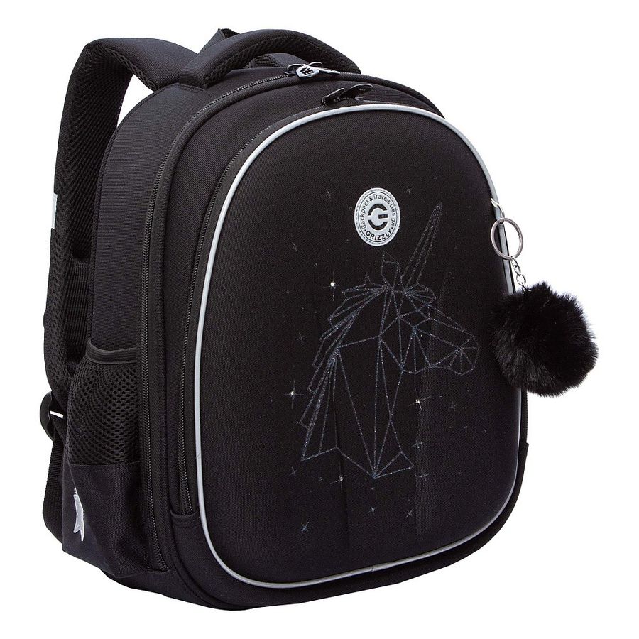 Рюкзак школьный 2отд. Черный-серебро 28х36х20см с помпоном GRIZZLY