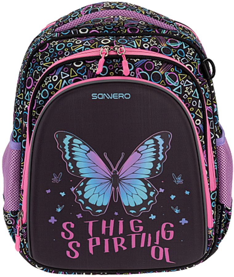Рюкзак "Sanvero" жесткий 37х29х19, ТРИ отделения на молнии, 2 боковых кармана на резинке, в основном отделении - 3 внутренних отделения, именная карточка для заполнения, в переднем отделении - карман для мелочей, жесткая панель фасада, эргономичная формоустойчивая вентилируемая спинка, эргономичные вентилируемые лямки с распределителями нагрузки, нагрудный ремень, жесткая вентилируемая ручка, износостойкий водонепроницаемый материал со светоотражателями, цвет черный с цветным рисунком, уникальная по красоте термическая печать НА ФАСАДЕ РЮКЗАКА на двойном нейлоновом полиэстере, яркий высококачественный принт. Цвет серый с разноцветными ярким паттерном - бабочка.