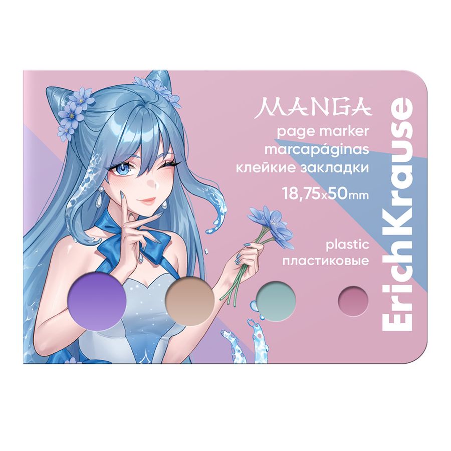 Клейкие закладки пластиковые ErichKrause предназначены для временных пометок страниц. На закладках можно делать надписи. Изготовлены из цветной полупрозрачной полимерной пленки, которая не закрывает текст страницы. Специальный клеевой состав позволяет надежно крепить и многократно переклеивать закладки, не оставляя следов и не повреждая поверхность. Размер закладки - 18.75x50 мм. В упаковке 4 цвета коллекции Manga по 50 листов.
