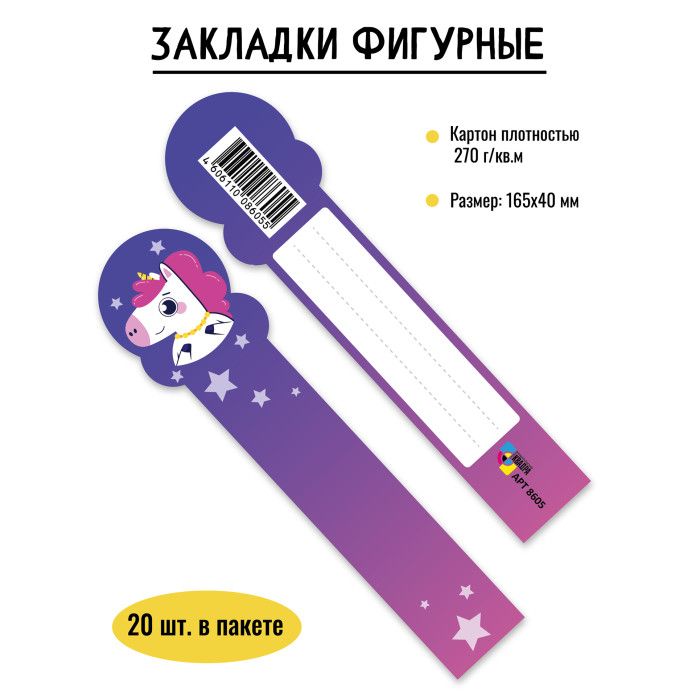 Закладка картонная. Размер: 165х40 мм. Материал: картон целлюлозный двухстороннего мелования, плотностью 270 г/кв.м Печать: офсетная, полноцветная двухсторонняя (4+4), ВД лак с лицевой стороны. Постпечатная обработка: вырубка фигурная.