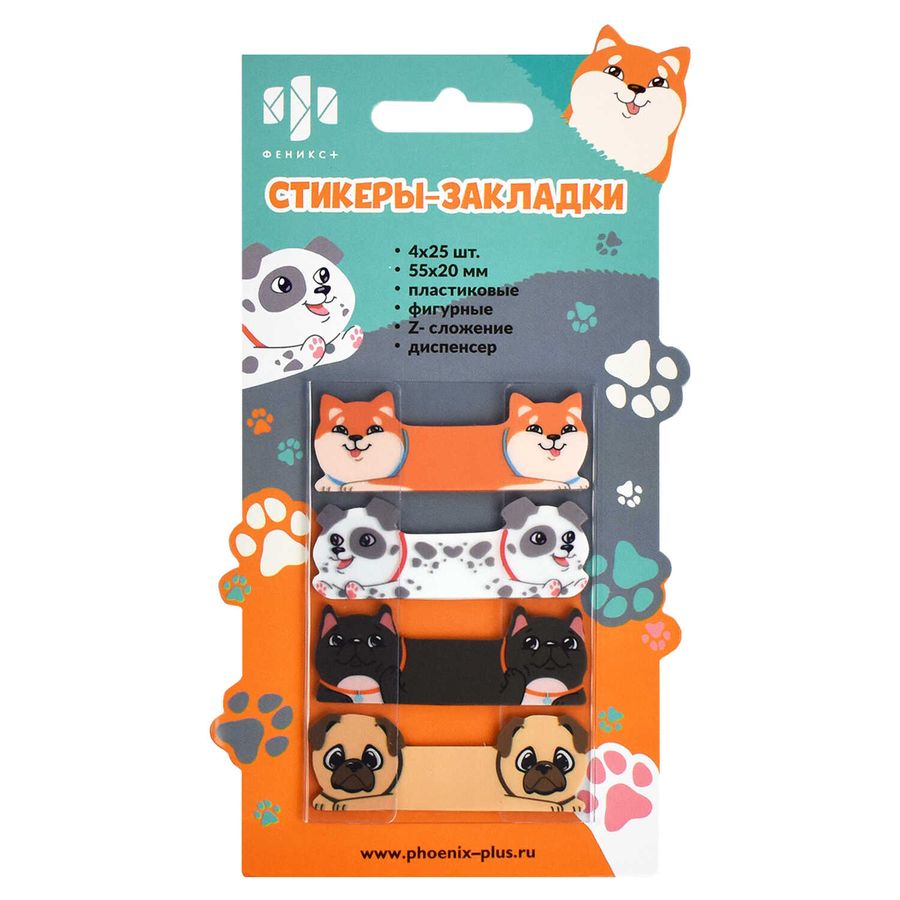 Стикеры-закладки пластиковые, 55x20 мм, 100 шт., арт. 65200 / 48 СОБАКИ (материал: пластик цвет: бежевый, оранжевый, серый; кол-во цветов: 4, кол-во каждого цвета: 25, форма: фигурная, декор: полноцветная печать; тип сложения: Z-сложение; наличие диспенсера: есть, материал диспенсера: ПВХ; индивидуальная упаковка: подложка с европодвесом из мелованного картона + ПЭТ-пакет)