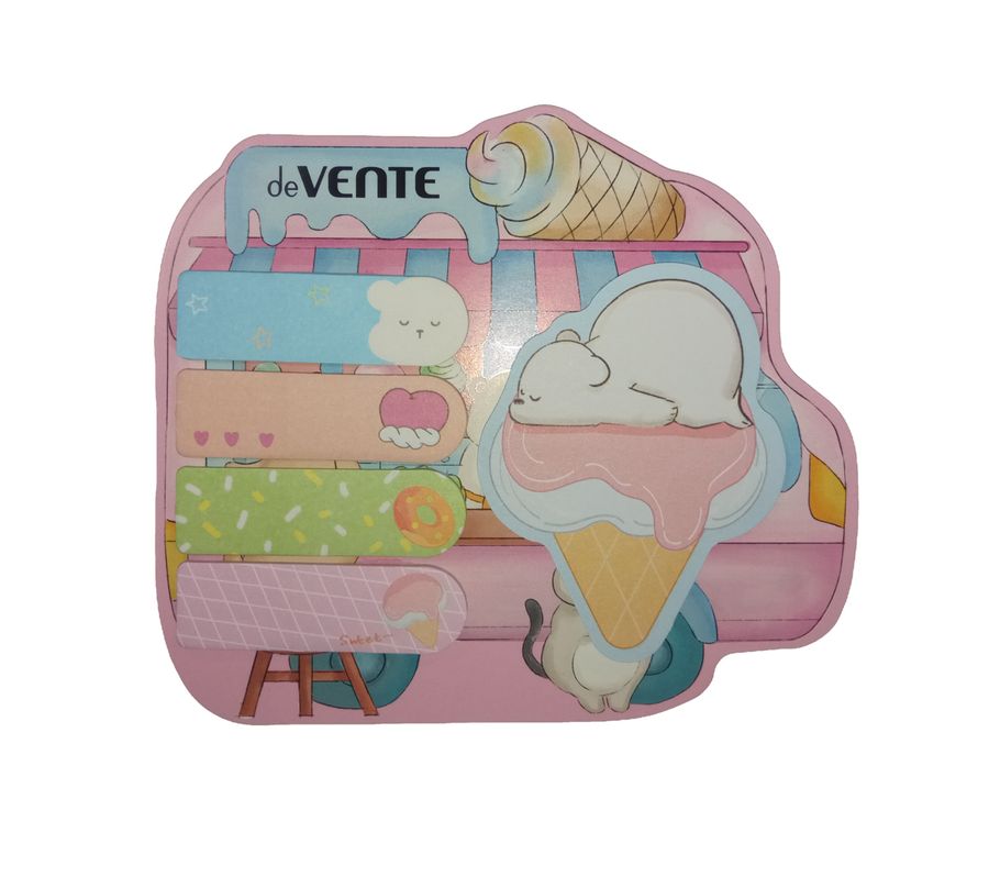 Набор клейкой бумаги для заметок "deVENTE. Bear&Ice cream", размер заметок: 50x15 мм и 55x71 мм, 5x20 листов, офсет 80 г/м², печать 4+0, ассорти форм, 5 дизайнов, в картонном блистере и пластиковом пакете с европодвесом