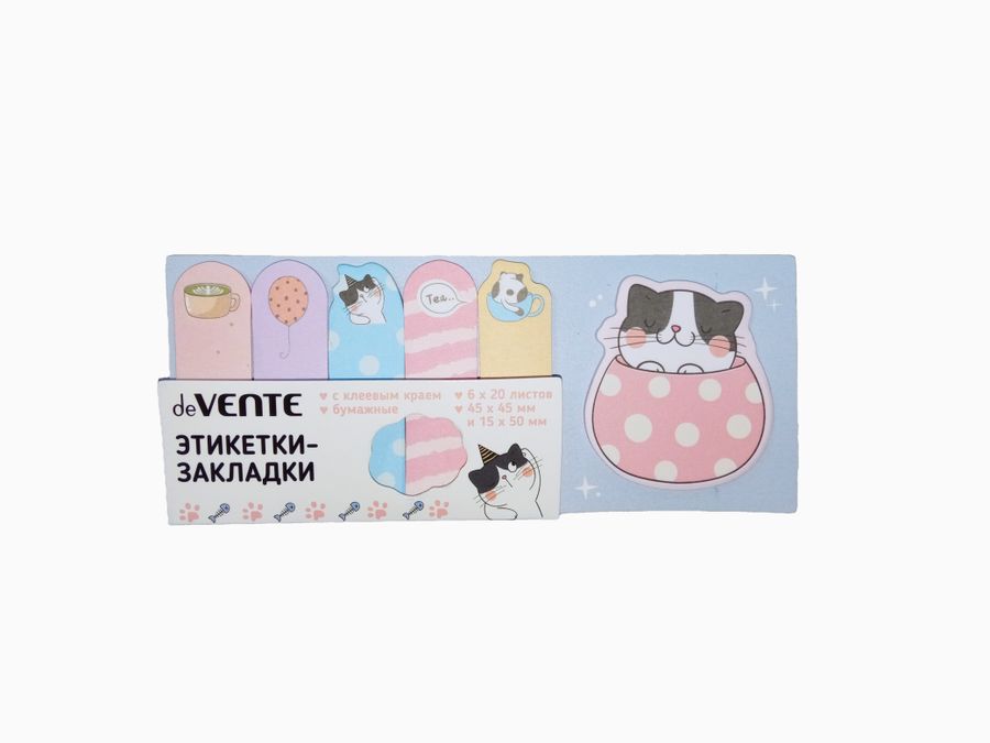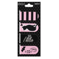 Набор самоклеящихся этикеток-закладок "Black&White cat" бумажные 45x45 мм и 15x50 мм, 6x20 листов, офсет 80 г/м², печать 4+0, ассорти форм, 6 дизайнов, в пластиковом пакете с европодвесом