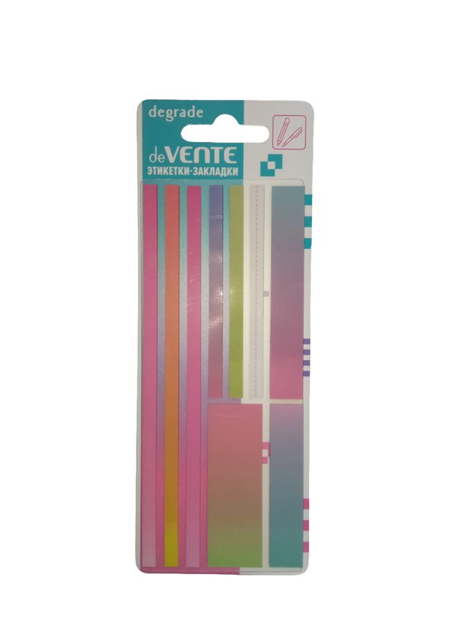 Набор самоклеящихся этикеток-закладок "deVENTE. Degrade" пластиковые полупрозрачные, разноцветные, 54x20 мм, 54x15 мм, 54x10 мм, 54x5 мм, 10x20 листов, 2 дизайна, в картонном блистере и пластиковом пакете с европодвесом.